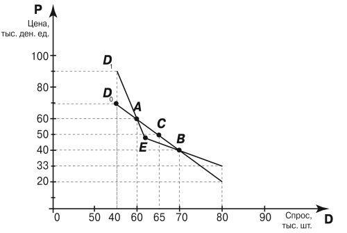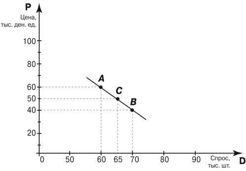 Здесь кривая спроса строится, по сути, на предположении о том, что если соединить прямой точки, соответствующие фактическим величинам спроса при определенных уровнях цен, то она будет описывать те величины спроса, которые могут возникнуть на рынке при всех значениях цен в данном диапазоне. Например, для рассмотренного выше примера мы предположим, что если цене 60 тыс. ден. ед. соответствует величина спроса 60 тыс. шт. (точка А), а цене 40 тыс. ден. ед. – величина спроса 70 тыс. шт. (точка В), то при цене 50 тыс. ден. ед. величина спроса составит 65 тыс. шт. (точка С).