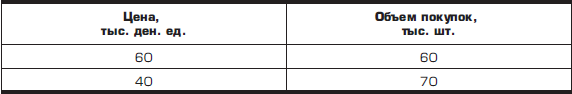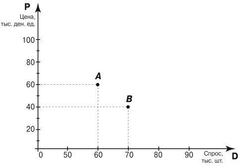 Подобного рода шкалы и графики являются полезным инструментом при анализе решений о возможной цене на новый товар или изменении цены на уже выпускаемый. Вместе с тем нельзя забывать о том, что любые фактические данные отражают ситуации, существовавшие на рынке в прошлом. В данном случае график показывает, что при цене 60 тыс. ден. ед. удавалось продать 60 тыс. шт. товара (этой ситуации соответствует точка А). При снижении цены до 40 тыс. ден. ед. объем покупок возрос до 70 тыс. шт. (точка В).