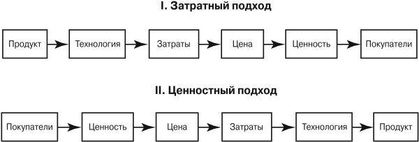 Строго говоря, конфликты между финансистами и маркетологами по вопросу политики цен обычно возникают в тех фирмах, где руководство не сделало четкого выбора между двумя альтернативными подходами к ценообразованию: затратным и ценностным (рис. 2.1).