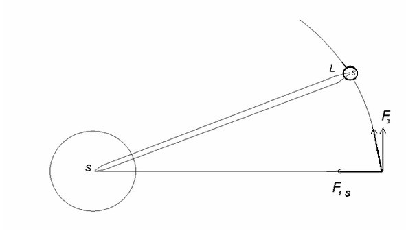 При взаимодействии Солнца и Земли их гравитационно-пространственные поля накладываются друг на друга. В силу того, что гравитационно-пространственный потенциал Солнца выше, чем у Земли, вектор напряженности их общего поля направлен к центру звезды, но не на всей протяженности разделяющего их пространства (рис. 4).