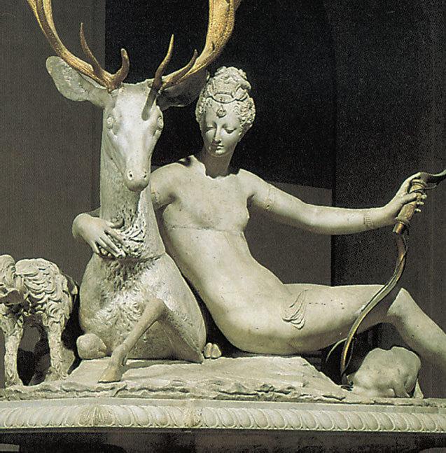 Артемида только что вошла в грот. Она отдала лук и стрелы одной из нимф и готовилась к купанью. Нимфы сняли с богини сандалии, волосы завязали узлом, и уже хотели идти к ручью зачерпнуть студеной воды, как у входа в грот показался Актеон. Громко вскрикнули нимфы, увидав входящего Актеона. Они окружили Артемиду, чтобы скрыть ее от взора смертного. Подобно тому, как пурпурным огнем зажигает облака восходящее солнце, так зарделось краской гнева лицо богини, гневом сверкнули ее очи, и еще прекраснее стала она. Разгневалась Артемида, что Актеон нарушил ее покой. В гневе Артемида превратила несчастного Актеона в стройного оленя.