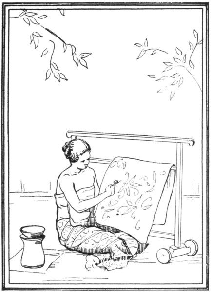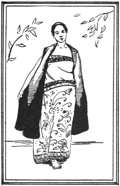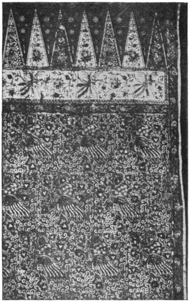 Books issued by the Dutch Government to promote the batik craft, picture Javanese women and girls seated upon fiber mats before a vertical frame upon which the material is hung for the execution of their art. Men too are at work printing and dyeing these fabrics. Housewives in staid processionals display the occupation. Princes and fine ladies disport their gorgeous costumes. Priests climbing the steps of their temples past the long rows of their sacred gods are resplendent in batik array. Their oldest gods are clothed in sculptured batik.
