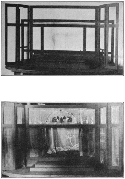 The fires, realistic in color, were painted in and stopped out with wax. The panels were dyed blue. The spaces back of the fires and the council were stopped out with wax and the whole dyed a deep purple. This stage construction is suitable for the end of a room or hall where there is no balcony or for out-of-doors.