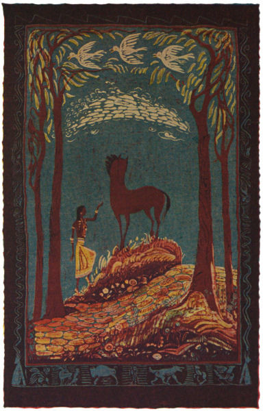 The sky and the blue of the border were next stopped out, leaving for the next bath the pony, the remainder of the Indian maiden, the tree trunks and other shapes in the foreground.
