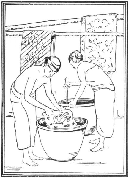 The material was dipped several times, once in yellow, twice in red (more red was added to the dye-bath after the first red was exhausted), twice in the blue which was developed the same as the red, and at last back into the yellow. When the dyeing was completed the piece was thoroughly rinsed and the wax was removed.