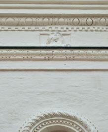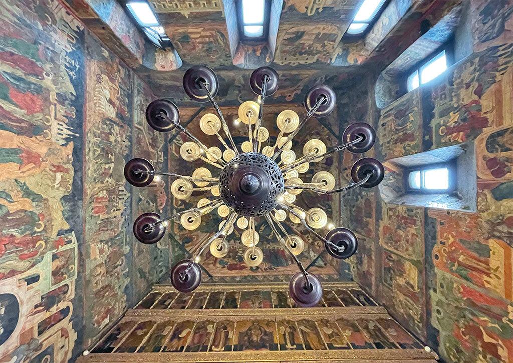 Уникально, удивительно, умопомрачительно! Круглые медальоны, в каждом из которых свой рисунок, замысловатая вязь между ними. И всё это на выцветшем, но когда-то ярком синем фоне. Так вышло, что ни в одном из древнерусских храмов, уцелевших до наших дней, не сохранилось ничего похожего на этот орнамент в оконных откосах.