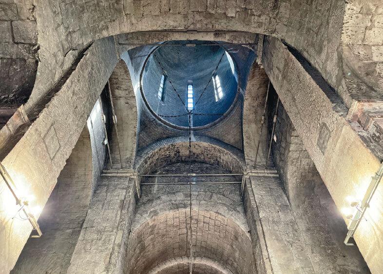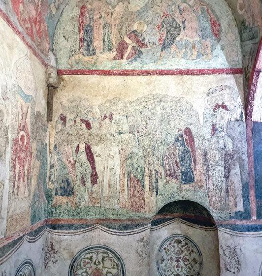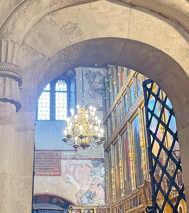 Сегодня, зайдя в храм, видишь аскетичную и впечатляющую средневековую архитектуру. Но никаких росписей там нет. На самом деле – есть. Так вышло, что многочисленные перестройки и катастрофы, которые пришлись на биографию здания, почти не тронули его алтарную часть. И даже, как ни парадоксально, спасли её. Узкие, вытянутые окна апсид в своё время заложили. А когда в 1950-х кладку демонтировали, то на откосах обнаружился рисунок. И да, это как раз Андрей Рублёв.