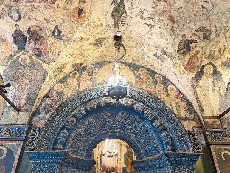 Единственный недостаток этой работы Рублёва в том, что находится она в алтарной части. Вход туда возможен только священникам или церковным служащим мужского пола. Но во время богослужений, когда царские врата алтаря открываются, особо внимательные могут рассмотреть проступающие, будто в дымке, бесценные рисунки.