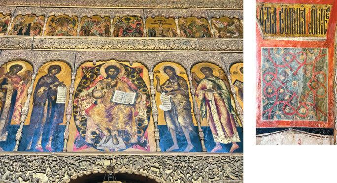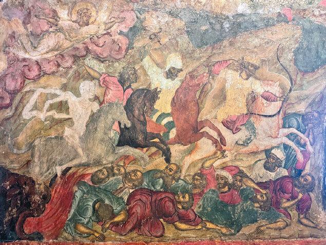 Особого внимания тут заслуживают изображения на стенах под колокольней придела Иоанна Богослова. Тут в деталях зафиксированы разные сцены из Апокалипсиса. Собственно, с именем этого святого и связаны описания того, что произойдёт перед вторым пришествием Иисуса Христа. Воскрешение мёртвых, всевозможные природные катаклизмы, легендарные четыре всадника, каждый из которых символизирует какое-то бедствие.
