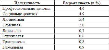 Во второй группе несколько выше показатели статусно-ролевых позиций, связанных с образованием и деятельностью. В то же время в первой группе преобладают показатели рефлексивной и семейной идентичностей. Но, учитывая, что выборки небольшие, можно говорить лишь о некоторой тенденции большей выраженности профессиональной и деловой идентичности у испытуемых, которые легче переживают кризис. Можно с долей вероятности сказать, что кризис идентичности проявляется в сужении социальных категорий, большей выраженности характеристик, связанных со знакомыми, понятными общностями (семья, друзья и т. п.), в которых индивид чувствует себя защищенным и востребованным, лучше ориентируется в системе требований, норм и личностных перспектив.