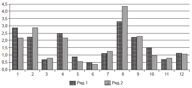 Ряд 1 – первая группа, ряд 2 – вторая группа.