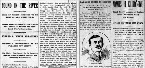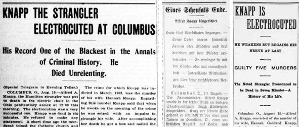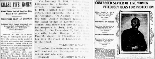 На языке оригинала: «On January 21, 1894, I killed. Emma Littleman in, a lumber yard in Gest street, Cincinnati. On August 1, 1894, I killed May Eckert, in Walnut street, opposite the Y. M. C. A. in Cincinnati. On August 7, 1894, I killed my wife, Jennie Connors Knapp, under the canal bridge in Liberty street, Cincinnati and thirew her into the canal. In Indianapolis, in July, 1895, I killed Ida Gebhard. On December 22,1902, I killed my wife, Annie Knapp, at 339 South Fourth street, in Hamilton, and threw her into the river out by Linden wald. This is the truth. Albert Knapp