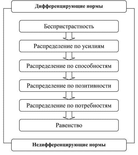 «Недифференцирующие» нормы предполагают распределение вознаграждения и наказания на основе психологических характеристик участников взаимодействия. Наиболее ярким представителем этого типа является равенство, в меньшей степени – распределение по потребностям. Распределение по позитивности занимает промежуточное положение[3] (Sabbagh, 2005) (рисунок 2).