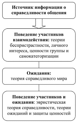 Таким образом, анализируя роль ожиданий в оценке справедливости взаимодействия, сторонники эвристической теории полагают, что они оказывают воздействие на обработку информации о текущем общении. Итоговая оценка справедливости всегда является результатом комбинации сведений о непосредственном взаимодействии и предварительных ожиданий. Это происходит, поскольку информация о справедливости, которую человек получает в первые минуты общения, отрывочна, противоречива и, следовательно, не дает полного представления о поведении участников. Вопрос состоит лишь в степени их воздействия: чем быстрее человек получает первые надежные сведения о справедливости взаимодействия, тем ниже роль предварительных ожиданий.