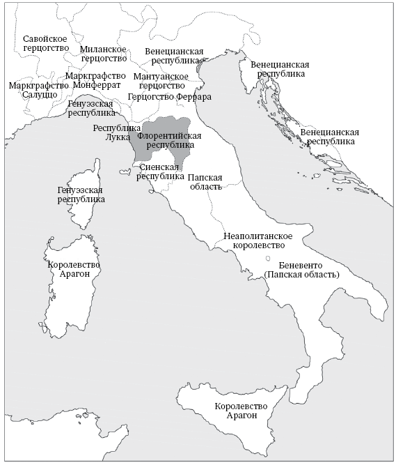 Ко времени, когда произошли эти события, Италия благоденствовала уже сорок лет. Мир воцарился еще в те далекие дни, когда под натиском османов пал Константинополь (1453). Европу тогда охватил страх, и уже в следующем году сильнейшие итальянские державы заключили в Лоди договор, к которому впоследствии присоединились швейцарцы. С тех пор конфликты с вовлечением государств происходили на полуострове лишь изредка, и почти всегда их воспламенял воинственный папа Сикст IV (1471–1484). Так что мирные соглашения оказались необычайно эффективны, если закрыть глаза на то, что они не отразились на внутренних делах Неаполитанского королевства, где даже в период их действия случилась гражданская война. Подобная безмятежность покажется поистине райской, если мы вспомним, что происходило в те годы в других частях Европы. Франция одолела Англию в Столетней войне (1453), но насладиться плодами победы не успела: страну тут же охватили внутренние распри, и правящий дом вступил в борьбу с влиятельными феодалами. В Англии на протяжении тридцати лет (1455–1485) грызлись между собой Ланкастеры и Йорки. Испания все еще была разделена на четыре отдельных королевства, и пусть даже брак Фердинанда Арагонского и Изабеллы Кастильской положил начало объединению большей части Пиренейского полуострова, стране еще предстояла изнурительная и кровавая гражданская война (1475–1479), а вскоре после ее завершения королевская чета повела военную кампанию против Гранады, последнего оплота мусульман в Европе; эта кампания длилась десять лет (1482–1492) и завершилась победой испанцев.