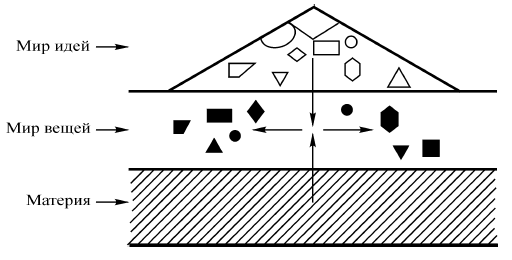 Взаимоотношение первых трех миров можно представить примерно такой схемой (которая во многом упрощена; в ней, например, не показаны родовидовые зависимости между идеями):