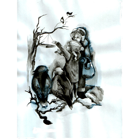 — Да, накормили снегирей, — расстроилась девочка, — сейчас сороки да голуби всё съедят. Маленьким птичкам ничего не достанется.