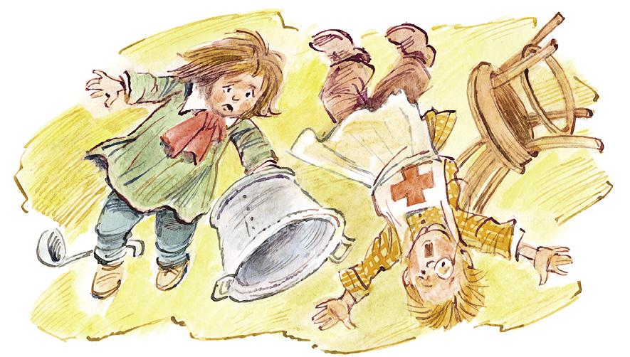Незнайка тоже не удержался на месте и, полетев в противоположную сторону, стукнулся головой о кастрюлю с кашей. От толчка жидкая манная каша выплеснулась прямо в лицо находившемуся неподалёку Пончику.