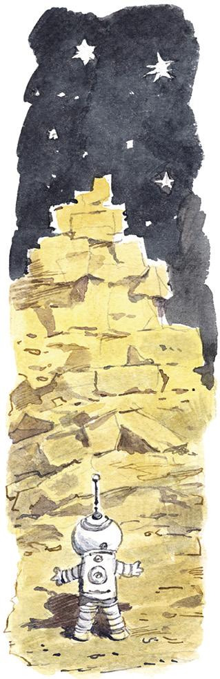 Впрочем, Знайка и сам отказался от своей блинной теории после того, как лично побывал на Луне и видел вблизи один из лунных кратеров. Ему удалось рассмотреть, что кольцевая гора была совсем не гора, а остатки разрушившейся от времени гигантской кирпичной стены. Хотя кирпичи в этой стене выветрились и потеряли свою первоначальную четырёхугольную форму, всё-таки можно было понять, что это именно кирпичи, а не просто куски обыкновенной горной породы. Особенно хорошо это было видно в тех местах, где стена сравнительно недавно обрушилась и отдельные кирпичи ещё не успели рассыпаться в прах.