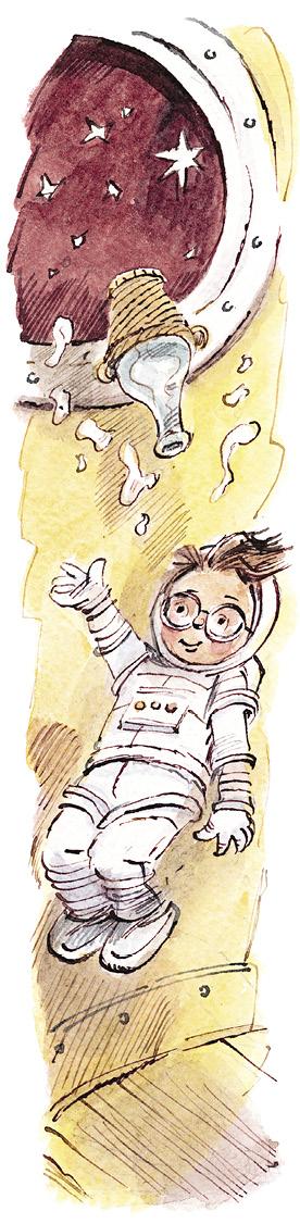 – Ну так вот, – продолжал Знайка. – Убедившись, что всё в порядке, я хотел опереться о пол ногами, но сделал это так резко, что подскочил кверху и ударился головой о потолок кабины. Я не учёл, понимаете, что моё тело потеряло вес и что теперь было достаточно лишь небольшого усилия, чтоб подскочить на страшную высоту. Поскольку моё тело совсем ничего не весило, я мог свободно висеть посреди кабины в любом положении, не опускаясь вниз и не поднимаясь вверх, но для этого нужно было вести себя осторожно и не делать резких движений. Вокруг меня так же свободно плавали предметы, которые мы не закрепили перед отправлением в полёт. Вода из бутылки не выливалась даже в том случае, если бутылку перевёртывали вверх дном, но если удавалось вытряхнуть воду из бутылки, то она собиралась в шарики, которые тоже свободно плавали в пространстве до тех пор, пока не притягивались к стенам кабины.
