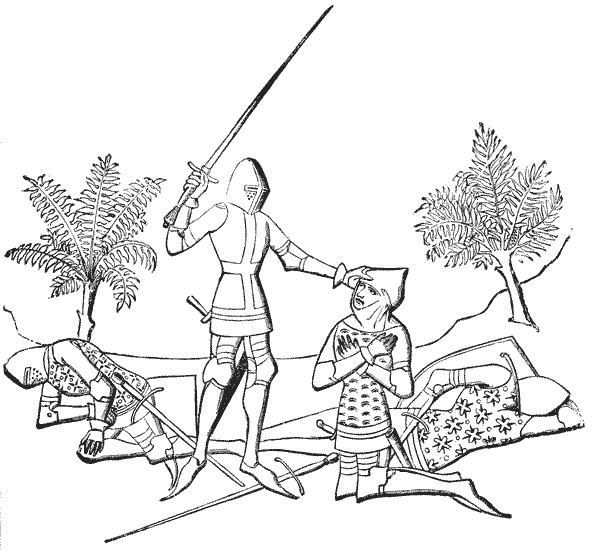 There was no weapon more cherished by the pirates' grandchildren than a blazing fire-brand, and the army stole through the town while their enemies still slept, stupid with eating and drinking, or weary from the previous day's harrying. They waked to find their houses in flames, the roofs crackling, a horrid [Pg249] glare of light, a bewilderment of smoke and shouts; the Normans ready to kill, to burn, to pen them back by sturdy guards at the streets' ends. There was a courageous resistance to this onslaught, but from early morning until the day was well spent the fight went on, and most of the invaders were cut to pieces. The dead men lay thick in the streets, and scattered everywhere about the adjacent fields. "Only those were spared who were worth sparing for the sake of their ransom. Many a Norman soldier, down to the meanest serving-man in the ranks, carried off his French prisoner; many a one carried off his two or three goodly steeds with their rich harness. In all Normandy there was not a prison that was not full of Frenchmen."[8] All this was done with scarcely any loss to the Normans, at least so we are told, and the news came to William that same evening, and made him thank God with great rejoicing. It would seem as if only a God of battles could be a very near and welcome sovereign to this soldier-lord of Normandy.