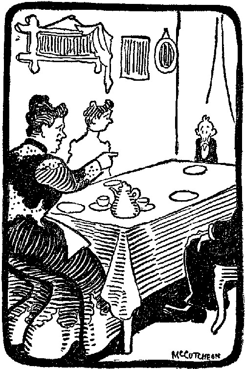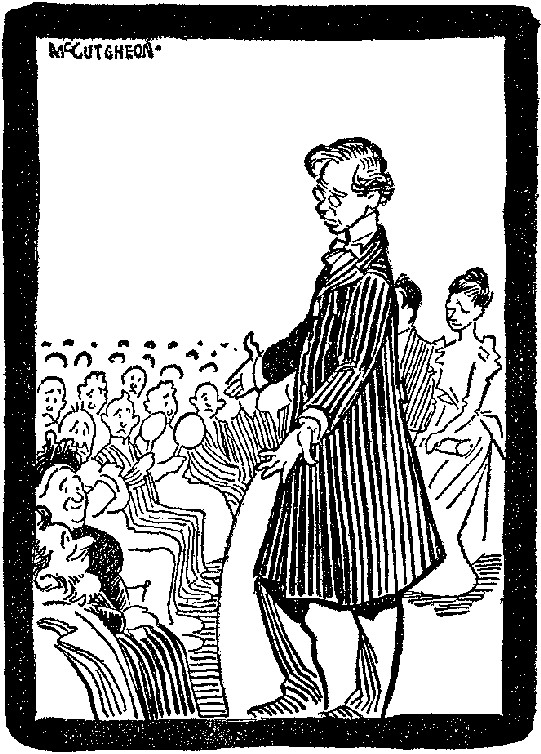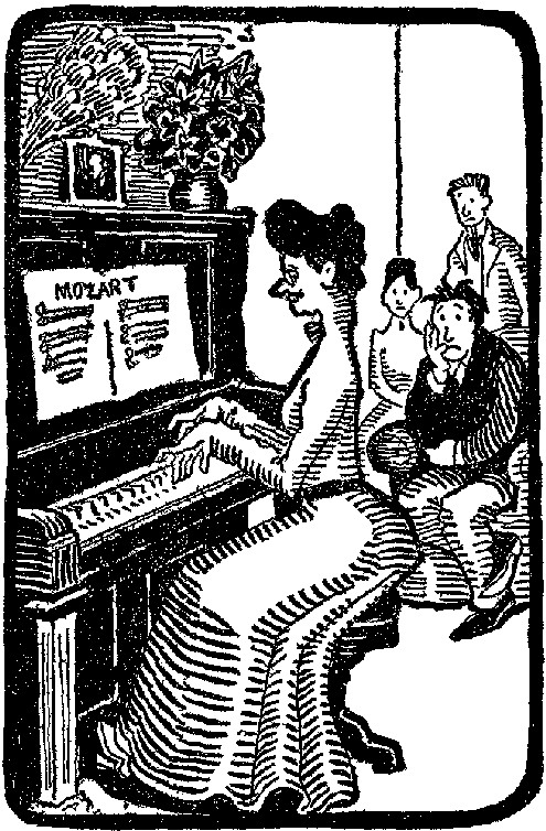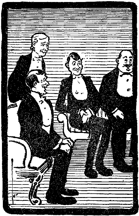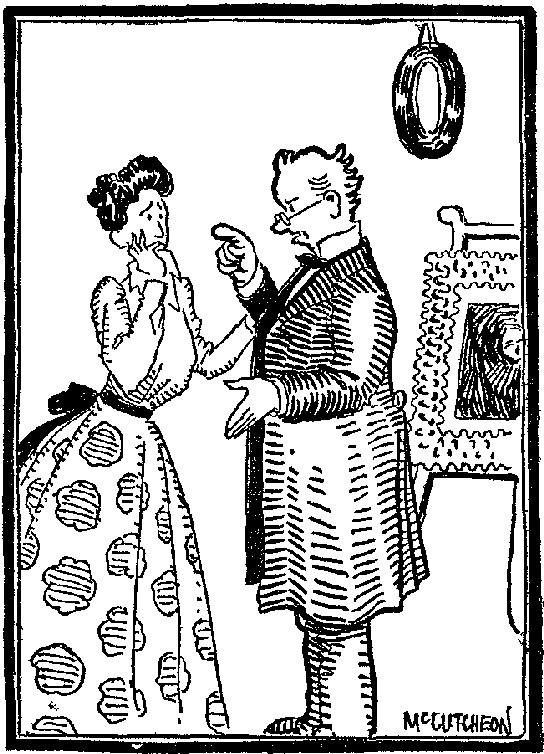 On the Evening already mentioned she had a Cluster of Geniuses on hand. They were expected to Talk for a couple of Hours, so as to work up an Appetite for Neapolitan Ice-Cream and Lady-Fingers. In the course of time they got around to the Topic of Modern Music. All agreed that the Music which seemed to catch on with the low-browed Public was exceedingly punk. They rather fancied "Parsifal" and were willing to concede that Vogner made good in Spots, but Mascagni they branded as a Crab. As for Victor Herbert and J.P. Sousa—back to the Water-Tanks!