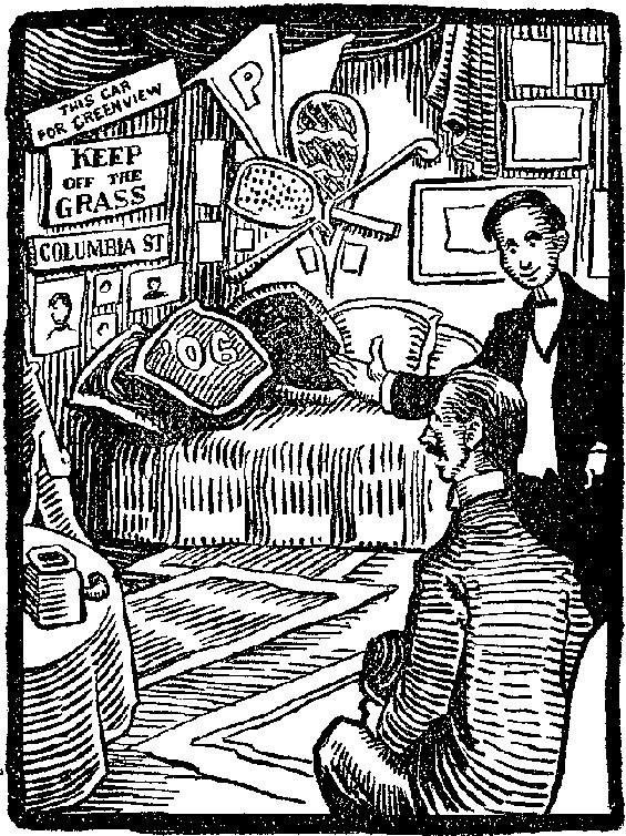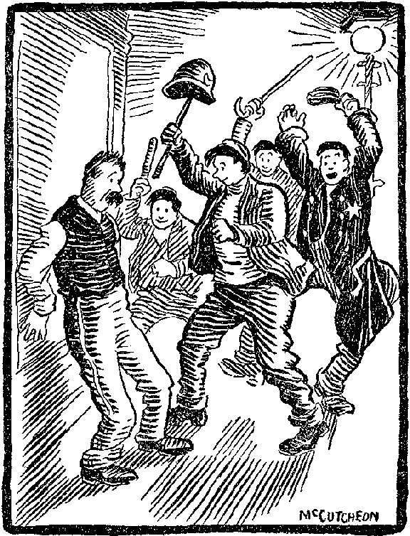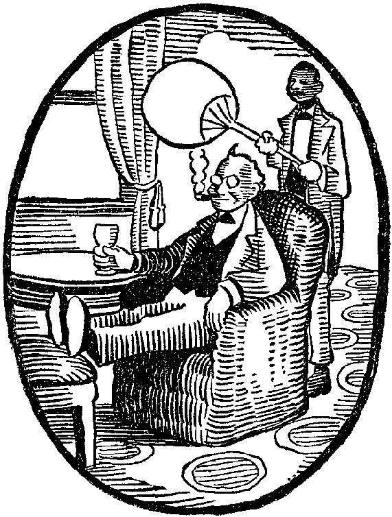 Then he found himself in a four-oared Cablet and the Sea became very Rough. There was something out of Whack with the Steering Gear, for instead of bringing up at his Boarding House he found himself at another Rum Parlor. The Man who owned the Place had lost the Key and could not lock up. Here he met several Delegates to a State Convention of a Fraternal Order having for its Purpose the uplifting of Mankind. They wore Blue Badges and were fighting to get their Money into the Cash Register. In a little while he and a red-headed Delegate were up by the Cigar Counter singing, "How can I bear to leave thee?" He put in an Application for Membership and then the next Picture that came out of the Fog was a Chop Suey Restaurant and everybody breaking Dishes.