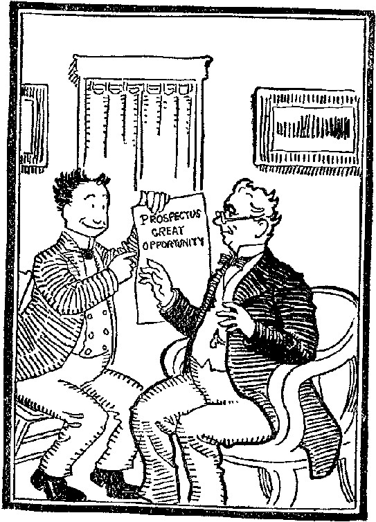 Professor Otis did the Dig Act year after year. At the age of 49 he was still M.A. and owned a House with a Mortgage on it. In the Meantime there had been revolutionary Changes in the World of Finance. Everything on Earth had been put into a Pool. Each Smooth Citizen who had something that was of no particular use to him went to work and Capitalized it. Brad closed out his Interests for so much Money that any one else would have been ashamed to take it. Then he and some other Buccaneers went down to Wall Street to have fun with several dignified Gentlemen whom Brad described as Them Fly Eastern Mugs. They succeeded in putting the Skids under a number of Persons who did not care to meet them Socially.