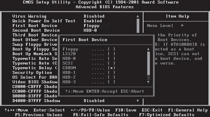 С помощью клавиш управления курсором переместитесь к варианту CDROMи нажмите Enter.
