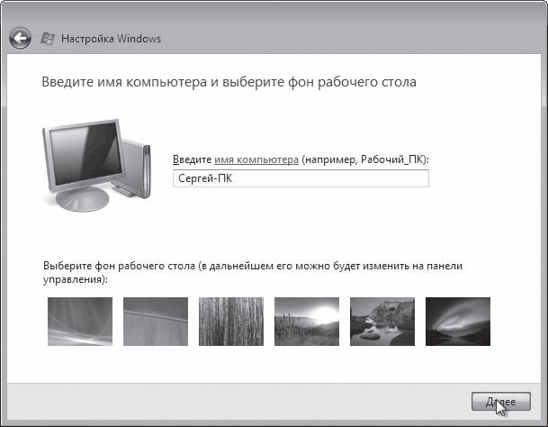 Нажмите Далее. На следующей странице (рис. 1.6) можно выбрать рисунок для Рабочего стола и ввести имя компьютера. Имя нужно, если вы собираетесь подключить свой компьютер к локальной сети.