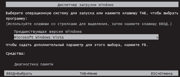 Когда установка Windows Vista закончится и компьютер перезагрузится, вы увидите на экране Диспетчер загрузки Windows (рис. 1.10). Учтите – если на компьютере несколько операционных систем, этот диспетчер появляется всякий раз при перезагрузке компьютера.