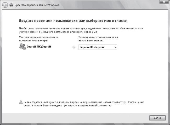 Проще, конечно, не плодить учетные записи, особенно если вы смутно представляете себе, что это такое. Поэтому лучше выбрать одну из готовых записей в списке Учетная запись пользователя на новом компьютере. Если вы все-таки хотите создать новую запись для переносимых параметров, придумайте и напишите ее имя в поле того же списка. Затем нажмите Далее.