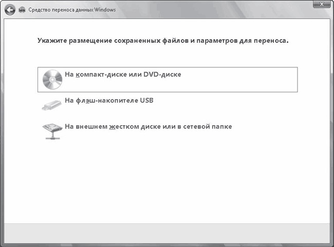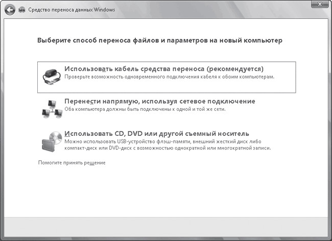 Первое окно является исключительно информационным, в нем ничего настроить нельзя, так что смело жмите кнопку Далее. В следующем окне укажите системе, что вы хотите выполнить Новый перенос, а затем щелкните кнопкой мыши на ссылке Исходный компьютер. Откроется очередное окно, в котором вам предстоит выбрать способ переноса файлов и параметров (рис. 1.11). Для примера применим последний вариант – Использовать CD, DVD или другой съемный носитель. Это значит, что данные будут скопированы на диск, а затем перенесены с него в новую операционную систему.