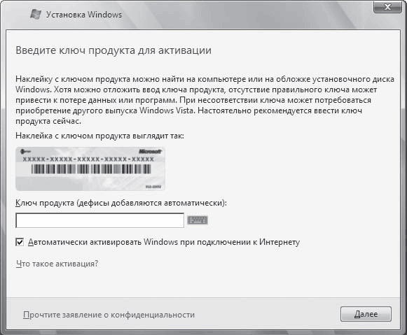 После этого откроется окно-«привратник» (рис. 1.4). Здесь нужно ввести ключ для активации Vista. Ключ – это особый код, от которого зависит, какая именно версия Windows Vista будет установлена. Он написан на установочном диске Vista.