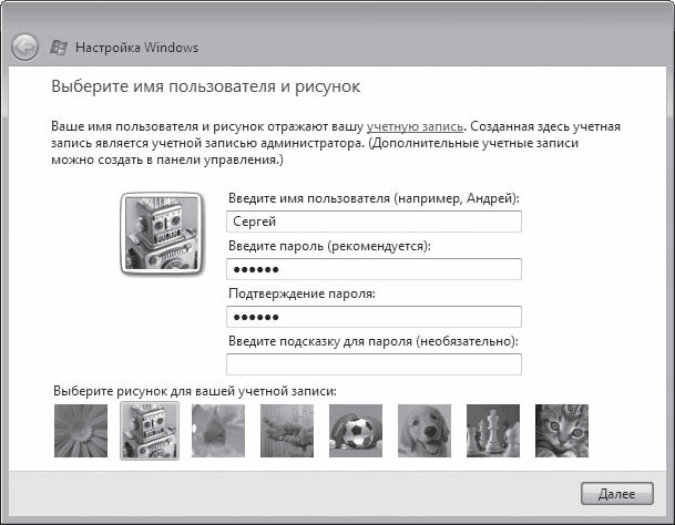 В первом окне (рис. 1.5) нужно ввести имя пользователя и пароль. Пароль не обязателен, но желателен, если не хотите, чтобы по вашему компьютеру ползали всякие посторонние люди. Имя пользователя и пароль вместе называются учетной записью (подробнее о ней поговорим в гл. 7). Кроме того, вам предложат выбрать рисунок для вашей учетной записи.
