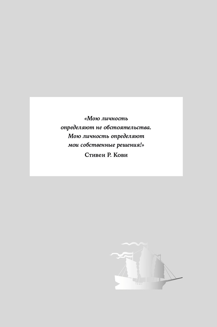 Семь навыков и принципы, лежащие в их основе, вас не подведут. Шаг за шагом они станут приближать вас к цели: привносить в вашу жизнь уверенность, независимость, осмысленность и счастье. Чтобы все получилось на 100%, в книге вас ждут тесты самоконтроля, чек-листы, опросники, упражнения и практические советы. Высокоэффективное личное лидерство невозможно без каждодневной практики в повседневной жизни. А теперь давайте проложим курс, расправим паруса и вместе отправимся в плавание — к независимой и осмысленной жизни!