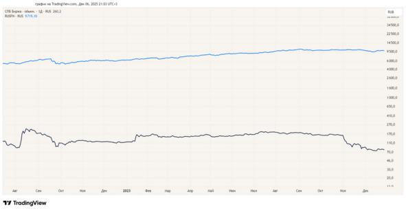 Например, мы исследуем график компании финансовой компании (расположен в нижней части рисунка 1.3). Сравним его с Индексом Мосбиржи финансов — график светло–синего цвета, в верхней части рисунка (рисунок 1.3).