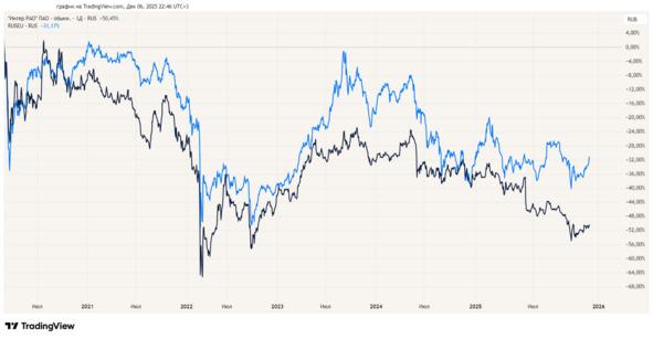 Приведу ещё один пример. Допустим, мы хотим купить акции энергетической компании «Интер РАО», сравниваем её с Индексом Мосбиржи электроэнергетики — светло–синий график — и видим, что в противоречие графики не вступают: акции «Интер РАО» растут в данный момент и одновременно индекс повышается (рисунок 1.4).