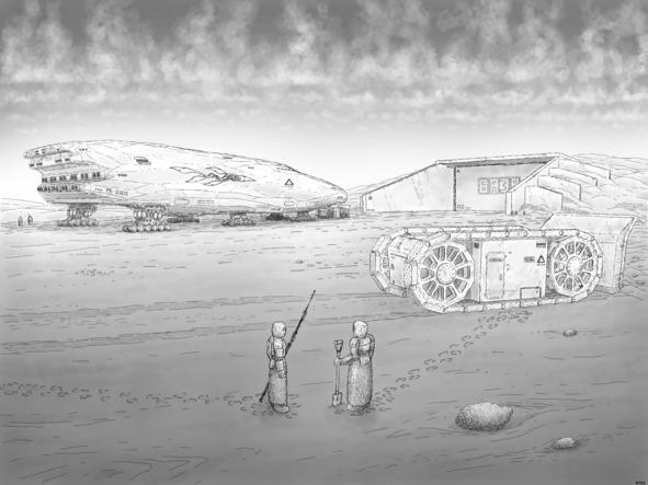 Опустить корабль на поверхность смогли не сразу. Только после того, как очередная буря ушла из района базы. После приземления подъехал гусеничный тягач. Он зацепил корабль и покатил его в подземный ангар.