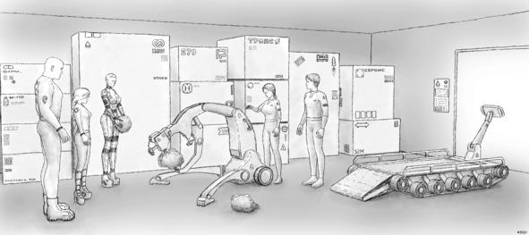 Иван и Ирина встретили нас и показали жилые комнаты. Потом провели в техническое отделение на склад. Иван выкатил устройство с манипулятором.
