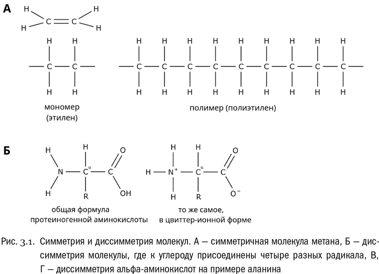 Аминокислота, как мы знаем, — это вещество, в молекуле которого одновременно есть карбоксильная группа и аминогруппа (см. главу 1). Особенность аминокислот, входящих в состав белков, в том, что эти две группы обязательно присоединены к одному и тому же атому углерода. Такие аминокислоты называются альфа-аминокислотами (см. рис. 3.1Б). Если в какой-нибудь аминокислоте карбоксильная группа и аминогруппа связаны с разными атомами углерода, то это не альфа-аминокислота и в состав белков она входить не может.