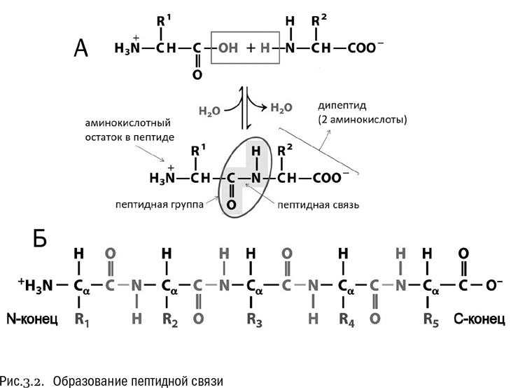 Группа –CO–NH– называется пептидной группой, а связь между углеродом и азотом в ней — пептидной связью. Цепочка аминокислот, соединенных пептидными связями, называется пептидом (см. рис. 3.2Б). Это более широкое понятие, чем белок. Все белки — пептиды, но не все пептиды — белки.
