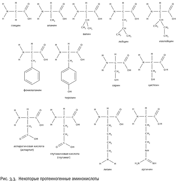 Аминокислоты, образующие белки, называют протеиногенными, от уже знакомого нам слова “протеин”. Две самые простые протеиногенные аминокислоты — глицин (где радикал — атом водорода) и аланин (где радикалом служит метильная группа –CH3). У других аминокислот радикалы сложнее. Для читателей-эрудитов добавим, что все нестандартные аминокислоты (селеноцистеин, пирролизин, гидроксилизин, гидроксипролин) так или иначе являются производными стандартных и нас пока не интересуют. А стандартных — ровно 20.