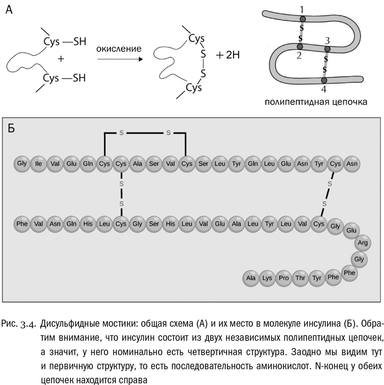 Есть и четвертый тип взаимодействий. Он зависит от единственной аминокислоты, радикалы которой могут образовать между собой аж ковалентные связи (не имеющие никакого отношения к пептидным). Эта аминокислота — цистеин. В радикале цистеина есть сульфгидрильная группа –SH, аналогичная спиртовой группе (–OH), но с атомом серы вместо атома кислорода. Целиком радикал цистеина имеет вид –CH2–SH. Так вот, уже в готовом белке может произойти реакция, при которой у двух таких радикалов будет отобран водород (его унесут специальные молекулы-переносчики), а свободные валентности атомов серы замкнутся друг на друга и образуют между остатками цистеина связь –S–S–. Это называется дисульфидным мостиком (см. рис. 3.4А). Белок вполне может быть в нескольких местах “сшит” такими мостиками (см. рис. 3.4Б). Причем реакция их образования обратима: дисульфидные мостики могут возникать и рваться, и это бывает важно для регуляции некоторых физиологических процессов.