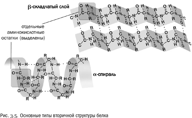 Два самых распространенных типа вторичной структуры белка — альфа-спираль и бета-слой. В альфа-спирали водородные связи постоянно образуются между аминокислотными остатками с номерами n и (n+4), то есть каждая аминокислота образует водородную связь с аминокислотой, четвертой по счету от нее. В результате получается компактная спираль, внутри которой находятся пептидные группы, а радикалы торчат в стороны. Альфа-спираль очень устойчива, в том числе и потому, что внутри нее в образовании водородных связей принимают участие все пептидные группы без исключения. В бета-слое полипептидная цепочка несколько раз перегибается, и водородные связи образуются между ее противоположно направленными отрезками.