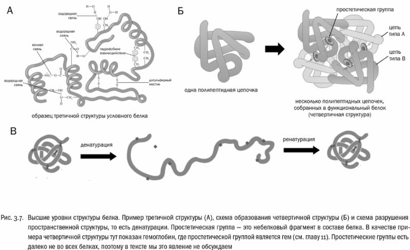 Потеря белком своей пространственной структуры без разрушения пептидных связей (то есть первичной структуры) называется денатурацией, что буквально значит “потеря природы” (см. рис. 3.7В). Самый простой способ денатурировать белок — как следует нагреть его. Именно частичная денатурация белков является основной целью любой тепловой обработки пищи. Причем иногда этот процесс до некоторой степени обратим (при кипячении молока, например). Восстановление пространственной структуры денатурированного белка называется ренатурацией. Но бывает и необратимая денатурация. Например, белок крутого яйца после полной необратимой денатурации растворенных там молекул белков становится твердым, потому что раскрученные полипептидные цепочки перепутываются между собой. Денатурация большинства белков (но не всех!) происходит при температуре 40–50 °С. Это определяет верхний температурный предел для жизни большинства земных живых существ.
