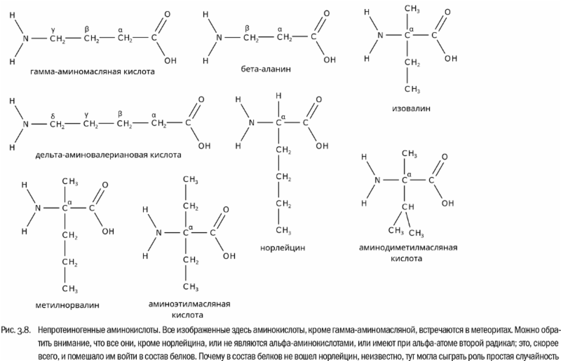 В знаменитом Мурчисонском метеорите, упавшем в 1969 году в Австралии, химический анализ обнаружил в общей сложности 52 аминокислоты5 (см. рис. 3.8). И они необыкновенно разнообразны. Например, среди этих аминокислот есть бета-аланин — изомер аланина, являющийся не альфа-, а бета-аминокислотой (NH2–CH2–CH2–COOH). Есть там гамма- и даже дельта-аминокислоты, например дельта-аминовалериановая кислота (NH2–CH2–CH2–CH2–CH2–COOH). Есть изовалин и метилнорвалин — аминокислоты, где к альфа-углеродному атому присоединены сразу два углеводородных радикала (как мы помним, в “белковых” аминокислотах на месте одного из них всегда атом водорода). Есть циклолейцин, где карбоксильная группа и аминогруппа присоединены к замкнутому пятичленному углеводородному кольцу. Перечислять странные аминокислоты, многие из которых встречаются исключительно в метеоритах, можно еще долго. Есть там, впрочем, и аминокислоты, входящие на Земле в двадцатку “белковых”, — глицин, аланин, валин, лейцин, изолейцин, аспартат, глутамат и пролин.