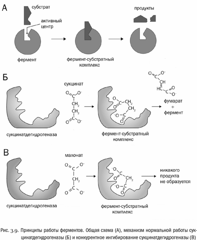 Однако возможна ситуация, когда на месте сукцината окажется малонат — анион малоновой кислоты, отличающейся от янтарной на один атом углерода (HOOC–CH2–COOH). Молекула малоната приблизительно подходит по форме к активному центру сукцинатдегидрогеназы и может его занять. Но поскольку соответствие все-таки неточное, никакой реакции в этом случае не произойдет (см. рис. 3.9В). Активный центр сукцинатдегидрогеназы будет просто заблокирован. Это называется конкурентным ингибированием. Конкурентное ингибирование — очень эффективный механизм “выключения” ферментов, на нем основано действие многих лекарств и ядов.