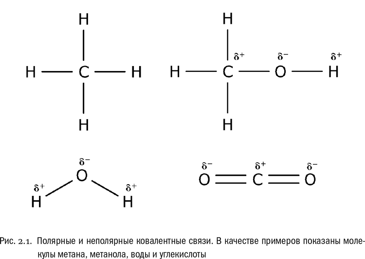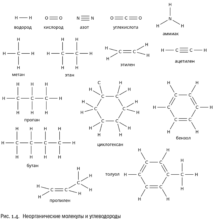 Итак, валентность водорода равна 1, кислорода — 2, азота — 3, углерода — 4 и фосфора — 5. Эти числа надо просто запомнить. Иногда у некоторых из перечисленных элементов бывают и другие валентности, но, занимаясь биологией, это можно игнорировать во всех случаях, кроме немногих особо оговоренных. Одновалентный водород, двухвалентный кислород, трехвалентный азот, четырехвалентный углерод и пятивалентный фосфор — главные химические слагаемые жизни (см. рис. 1.2).