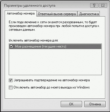 Функция автодозвона позволяет существующему подключению автоматически набирать номер телефона и соединяться с провайдером в случае разрыва связи и при любой попытке доступа к сетевым данным. Чтобы настроить автодозвон, в меню кнопки Пуск необходимо выбрать категорию Подключение, выделить нужное подключение, затем выполнить команду Дополнительно ► Параметры удаленного доступа. Для установки автонабора в области Включить автонабор номера для нужно установить флажок дозвона (рис. 1.1).